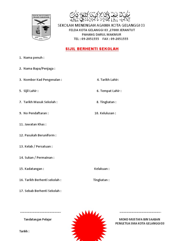 Surat rasmi berhenti sekolah tingkatan 6 kecemasan c. 2016 Tarikh Dikeluarkan Nama Pelajar.